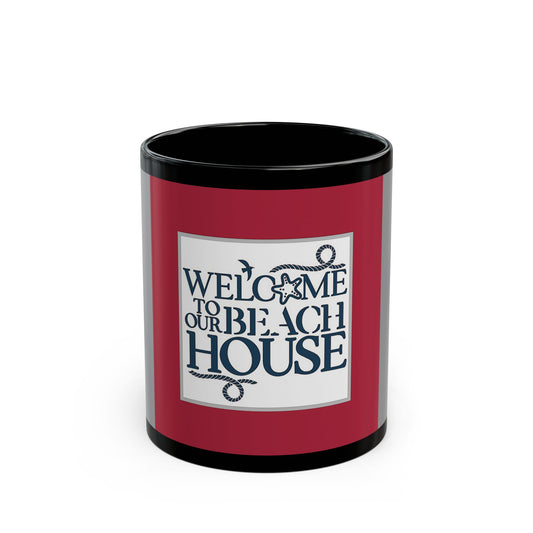 Red Welcome to our Beach House - 11 oz or 15 oz Ceramic Black Mugs- 11 oz or 15 oz Ceramic Black Mugs