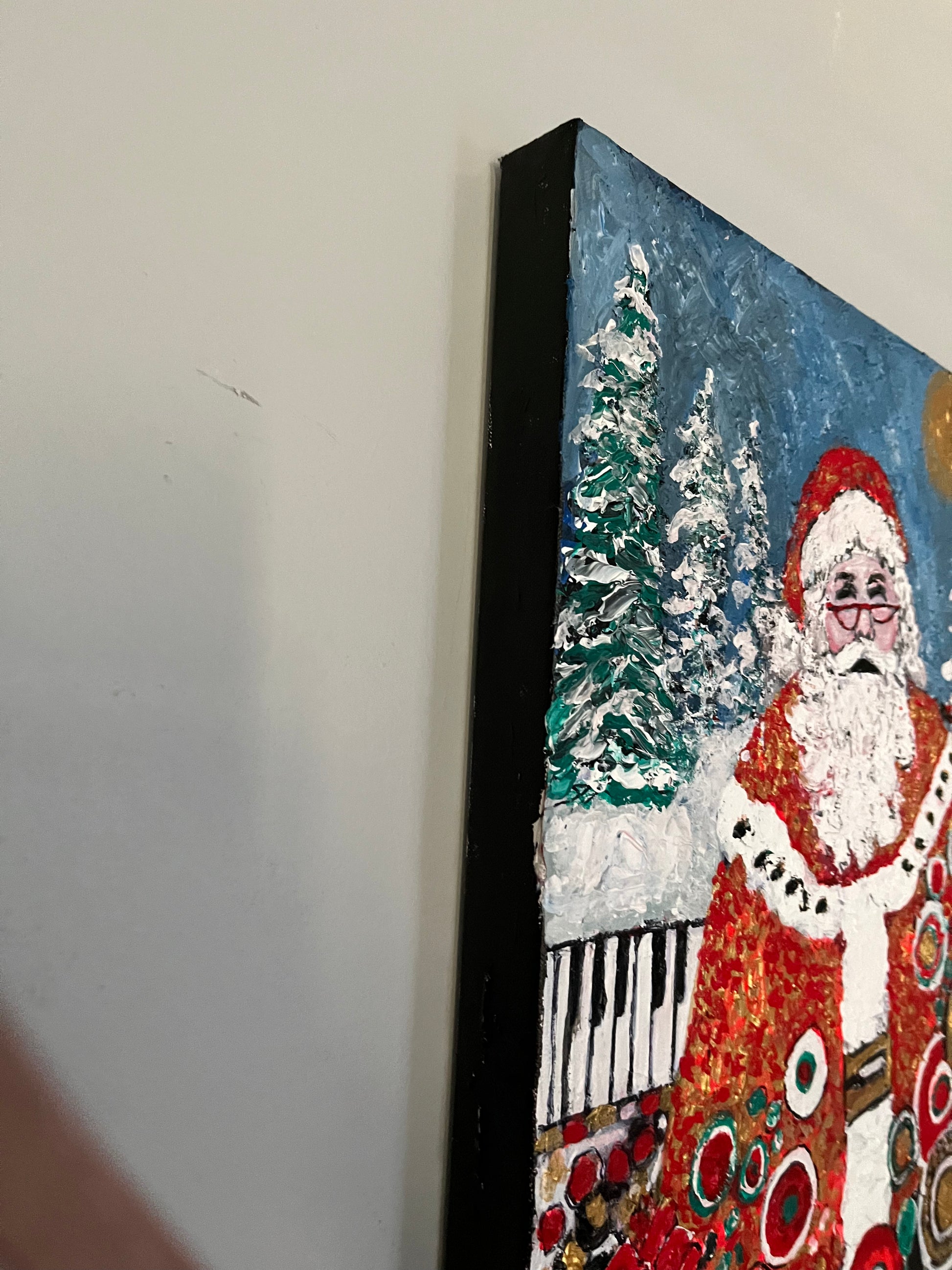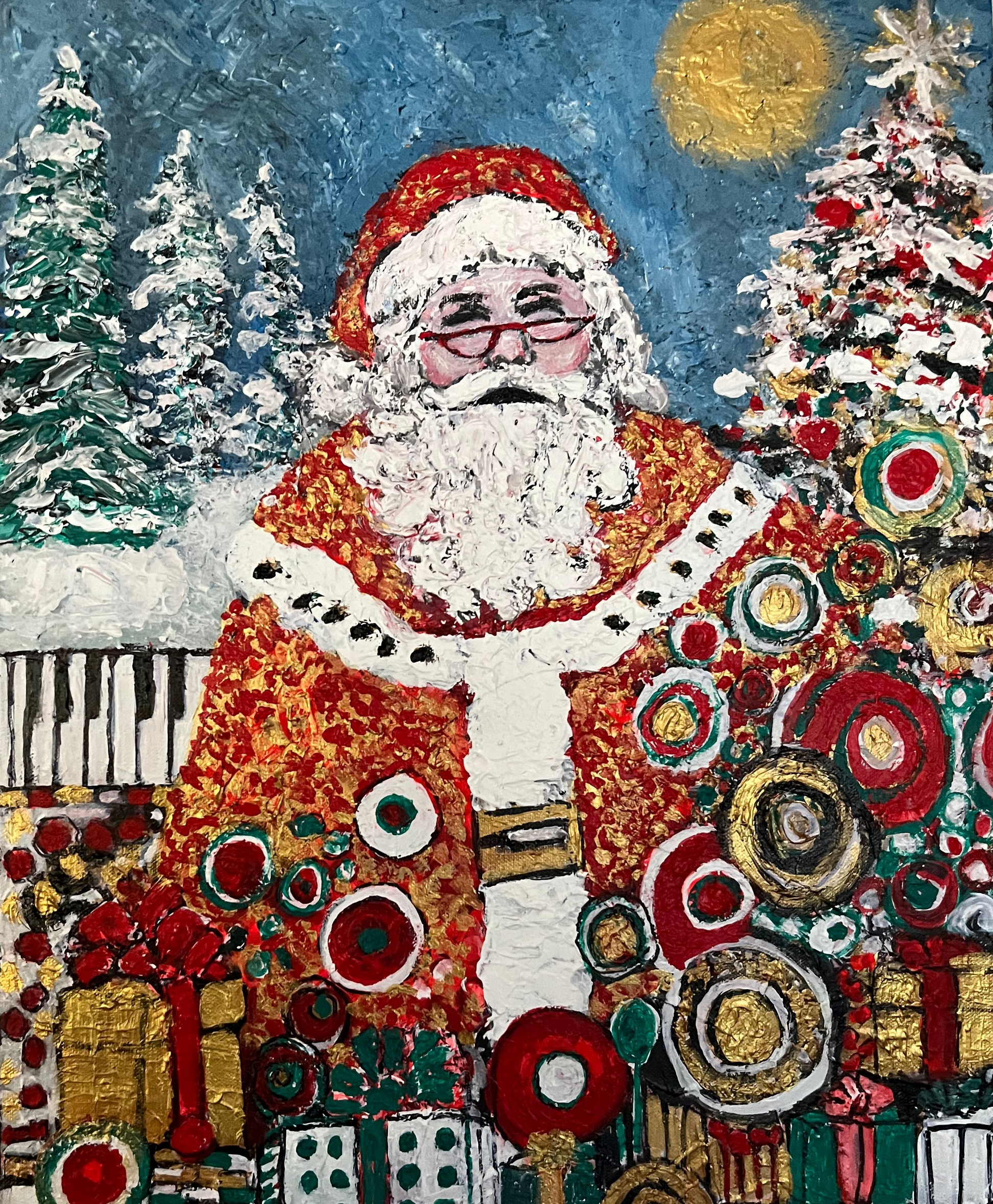 Celebrate the wonder of the season with Santa’s Magic, a textured acrylic painting bursting with holiday cheer. The background features layered, tactile textures, inviting the viewer to feel the depth of the artwork. Energetic, heavy brushstrokes shape the scene, with whimsical magic circles floating upward, adding a dreamy charm.
