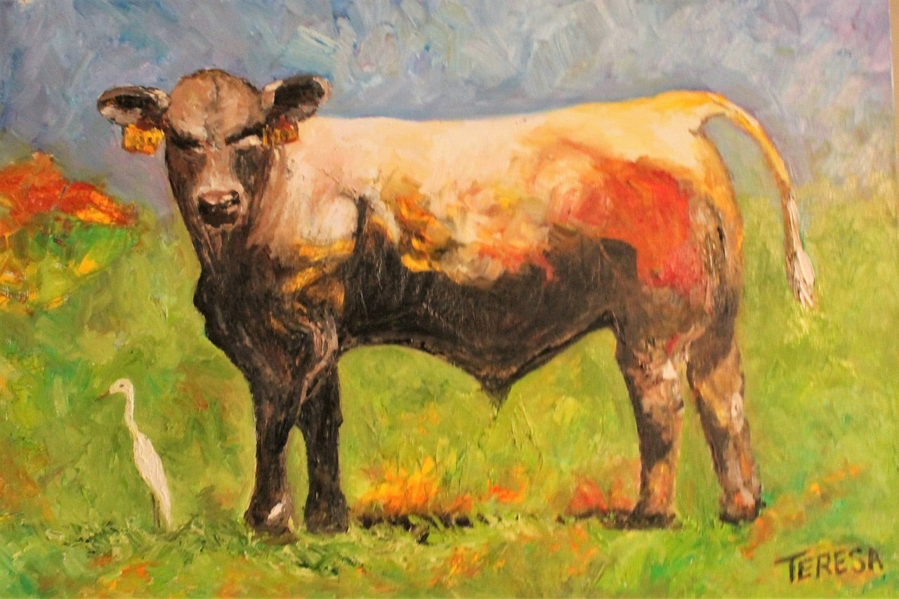 No Frame Needed – Ready to Hang Inspired by the quiet charm of North Florida’s cattle country, "White Egret and the Bull" captures a peaceful yet powerful moment shared between two unlikely companions. "White Egret and the Bull" is original 24x36x1 inch oil painting by Teresa Johnson features a graceful white egret standing near a sturdy, contented Bull—an everyday scene elevated by vivid color and rich texture.
